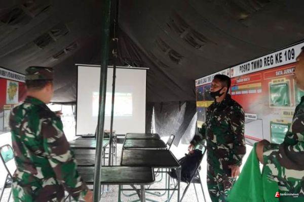 BREBES – Dandim 0713 Brebes, Letkol Armed Mohamad Haikal Sofyan, mengecek kesiapan Posko TMMD Reguler 109, yang didirikan di tenda pleton di Lapangan Sepakbola Desa Kalinusu, Kecamatan Bumiayu, Kabupaten Brebes, Jawa Tengah. Senin (21/9/2020).