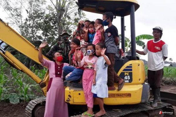 BREBES – Adanya alat berat untuk membuka jalan antar dusun di lokasi TMMD Reguler 109 Kodim 0713 Brebes, di Desa Kalinusu, Kecamatan Bumiayu, Kabupaten Brebes, Jawa Tengah, menjadi daya tarik tersendiri bagi anak-anak desa yang jarang melihatnya.