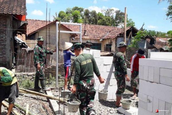 Tampak Danton Satgas TMMD Reguler 109, Lettu Infanteri Sumeri, tidak mau hanya berpangku tangan dan hanya mengawasi anggotanya yang sedang bekerja, namun ikut terjun langsung kerja di pembangunan rumah Makmuri (30), warga Dukuh Karanganyar RT. 02 RW. 01, Kalinusu, bersama masyarakat setempat. Rabu (23/9/2020).