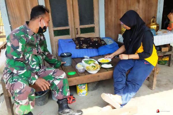 Terlihat Keakraban Anggota Satgas TMMD Sertu Nasiman sangat terlihat pada saat berkomunikasi dengan ibu Fatimah di teras depan rumahnya,sambil menikmati makanan seadanya.