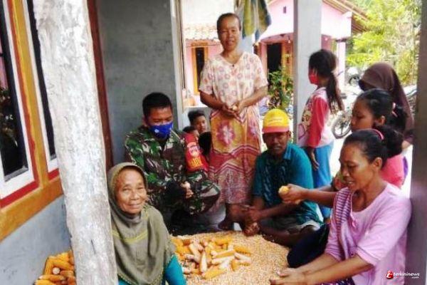 Tampak, Sertu Sunaryo, anggota Tim Jurnalis TMMD Reguler 109 Brebes, sedang di rumah Mimin (42), warga Dukuh Kedung Kandri RT/RW. 01, Kalinusu, untuk melihat kualitas panen jagung.