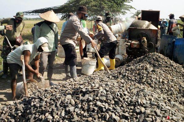 Personil Bhabinkamtibmas dari Polsek Kangkung,Polres Kendal sangat antusias dan terus bantu setiap hari pelaksanaan pengecoran jalan sasaran fisik TMMD di Desa Sendang kulon