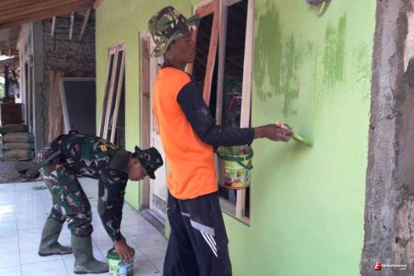 Tampak para tukang bangunan dari anggota Satgas TMMD dan warga setempat sedang melakukan pengecatan dinding dalam dan luar rumah. Selasa (29/9/2020).