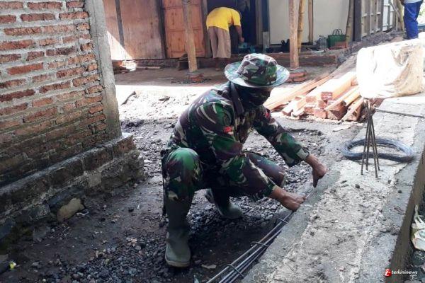 Salah satunya milik Ibu Ngatimah (65), Tampak Praka Hermawan, bergotong royong dengan tukang dari warga sedang menganyam besi untuk pembuatan pondasi rumah.