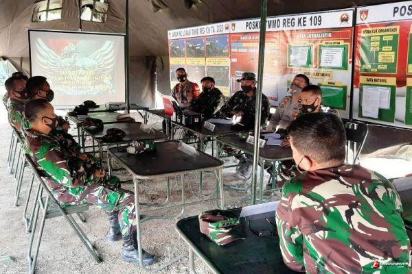BREBES – Dansatgas TMMD Reguler 109 Kodim 0713 Brebes, Letkol Armed Mohamad Haikal Sofyan, memaparkan capaian hasil pembangunan kepada Ketua Tim Wasev Itdam IV Diponegoro, Kolonel Infanteri Samsul Bakhri, S.Sos, MM, di Poskotis TMMD Reguler yang berada di Lapangan Sepakbola Desa Kalinusu, Kecamatan Bumiayu, Kabupaten Brebes, Jawa Tengah. Selasa (29/9/2020).