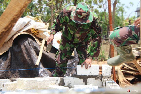 LAMONGAN ,- Pembangunan rumah tidak layak huni (RTLH) milik bapak Tumiadi di Desa Tebluru yang merupakan salah satu sasaran kegiatan fisik TMMD ke 109 Kodim 0812/Lamongan telah memasuki tahap pembangunan pasangan dinding bata rumah. Dengan cermat, kopda topan dari Yonzipur V/ BW selaku tim teknis TMMD ke 109 ini mengukur dan menimbang kelurusan dinding menggunakan benang untuk dijadikan pedoman dalam pasangan batu bata ini.