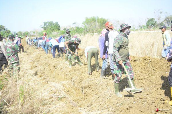 Jiwa ikhlas dengan penuh keceriaan dalam suasana gotong royong ditunjukkan warga dengan meninggalkan aktifitas kesehariannya demi membangun desanya bersama TNI.