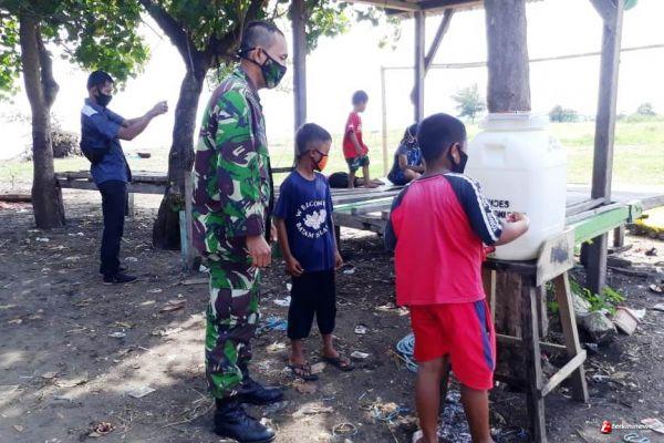 Sebelum anak-anak memulai belajar bersama, Sertu Agung mengajarkan anak anak untuk mencuci tangan dulu agar terhindar dari covid-19.