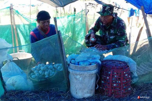 Pelda Supriyadi Satgas TMMD berkunjung dan melihat usaha telur asin yang berlokasi di sawah dekat lokasi TMMD.