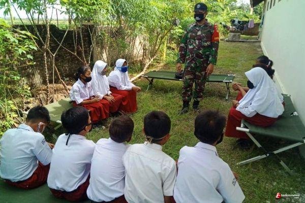 Terpantau Awak medis seorang anggota Satgas TMMD Reg 109 Kodim 0715/Kendal mengajar siswa SD dengan metode manual maupun Daring.
