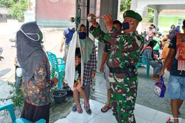 Di sela - sela kerja di sasaran fisik, anggota Satgas TMMD ke - 109 Kodim 0715/Kendal menyempatkan diri membantu kegiatan Imunisasi dan timbang balita di Posyandu Desa Sendang Kulon, Kecamatan Kangkung, Kabupaten Kendal.