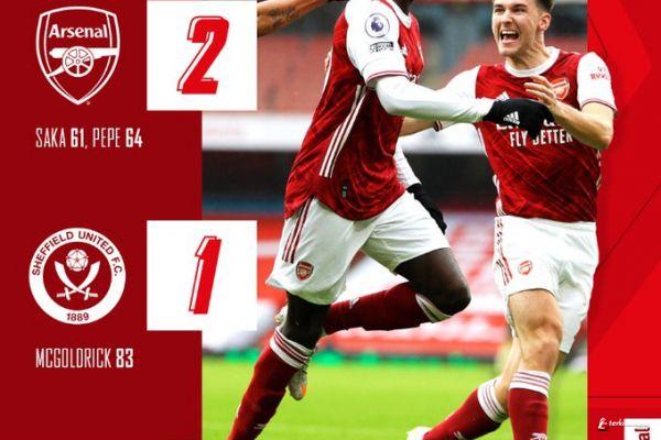 Bukayo Saka dan Nicolas Pepe mengemas dua gol kemenangan Arsenal, yang cuma bisa dibalas sekali oleh Sheffield lewat David McGoldrick, demikian catatan laman resmi Liga Inggris.
