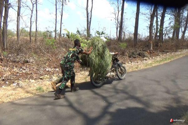 Tak canggung - canggung Serda M.Irsyad bergegas langsung menaikkan rumput satu sak yang jatuh ke atas motor warga kembali.