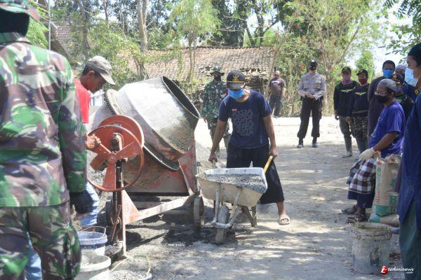 LAMONGAN - Program Tentara Manunggal Membangun Desa (TMMD) ke 109 Tahun 2020 Kodim 0812/Lamongan di Desa Tebluru, Kecamatan Solokuro, Kabupaten Lamongan, sudah mulai tampak akan hasilnya. Salah satunya dalam sasaran pengecoran jalan beton yang sudah mencapai sekitar 90 persen pengerjaannya.