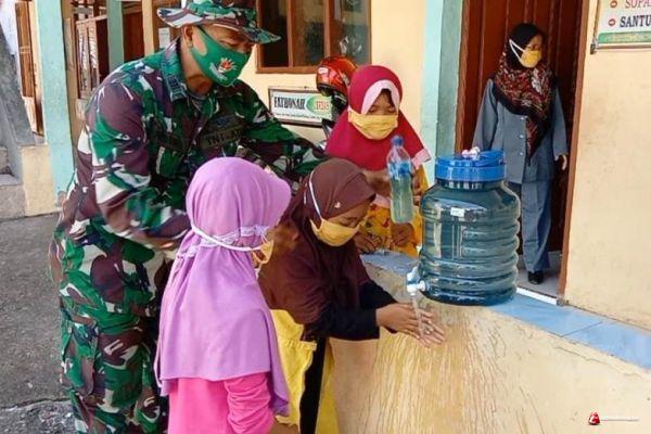 Tampak Pasiter Kodim Brebes, Kapten Arhanud Nediono, selaku koordinator lapangan Satgas TMMD Reguler 109 Brebes, menyempatkan waktunya untuk mengajarkan anak-anak Madrasah Ibtidaiyah (MI) Matlabul Ulum Kalinusu, tentang cara mencuci tangan yang baik dan benar dengan sabun di air yang mengalir selama minimal 20 detik, saat mereka mengumpulkan dan mengambil tugas sekolah yang diberikan oleh guru melalui Daring (dalam jaringan). Senin (5/10/2020).