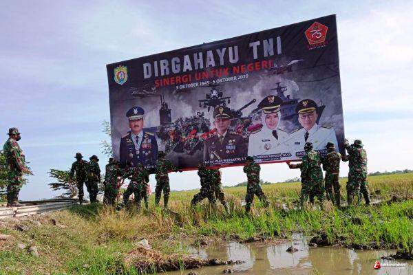KENDAL terkininews.com Menyambut HUT TNI (Tentara Nasional Indonesia) ke -75, personel Kodim 0715/Kendal yang tergabung dalam Satgas TMMD Reguler 109 memasang Baliho dalam rangka memeriahkan HUT TNI ke 75 Tahun itu .