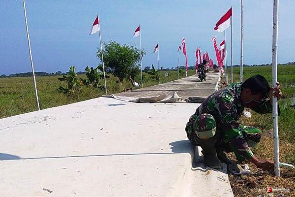 Semarak peringatan HUT TNI ke -75 juga tampak di lokasi betonisasi jalan yang merupakan sasaran pokok TMMD Reguler ke-109 Kodim 0715/Kendal di Desa Sendang Kulon, Kecamatan Kangkung, Kabupaten Kendal, Jawa Tengah.