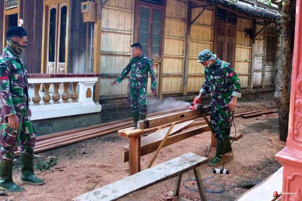 Pantauan di lapangan, pengerjaan pembangunan Pos Kamling yang dilakukan anggota Satgas bersama warga di Desa Sendang Kulon sudah mulai penyiapan kayu.