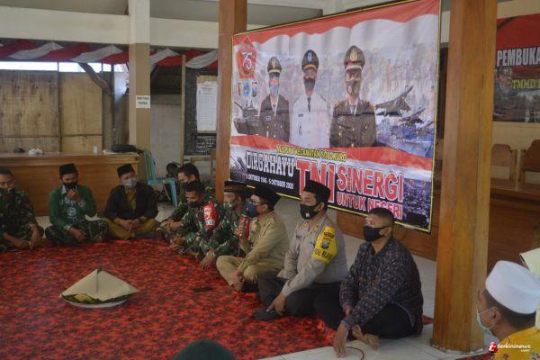 LAMONGAN - Syukuran HUT TNI Ke 75 yang dilaksanakan di Lokasi TNI Manunggal Membangun Desa (TMMD) ke-109 Kodim 0812 Lamongan digelar dengan acara sederhana dan membaur dengan lesehan bersama sejumlah tokoh masyarakat dan perangkat desa.