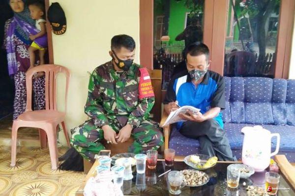 Tampak Danramil 01 Brebes, Kodim 0713 Brebes, Kapten Armed Zaenal Abidin, selaku piket Perwira Pengawas Satgas TMMD Reguler Brebes, melakukan koordinasi dengan perangkat desa setempat, Mukhsinin (41), Kepala Dusun Karanganyar, Desa Kalinusu. Selasa (6/10/2020).