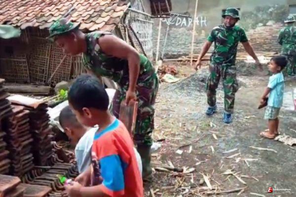 Dibenarkan Koptu Herlin, salah satu anggota Satgas TMMD yang ikut kerja di rumah yang berukuran 6 x 9 meter itu, bahwa bocah-bocah tersebut senang berada di tengah-tengah TNI yang sedang bekerja bersama warga setempat untuk langsir genteng secara manual maupun estafet guna menyelesaikan pemasangan genteng di rumah Sarto.