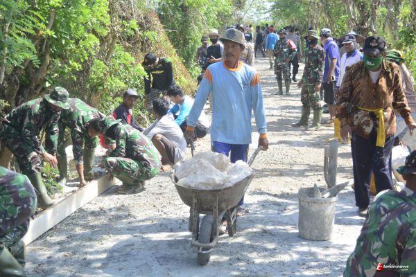 Dengan penuh semangat satgas TMMD 109 kodim 0812/Lamongan bersama dengan masyarakat mengerjakan jalan rabat beton sepanjang 900 meter di Desa Tebluru. Sekalipun rabat beton ini terkendala material yang jauh, namun tidak mengurangi semangat seluruh personil dan warga masyarakat.