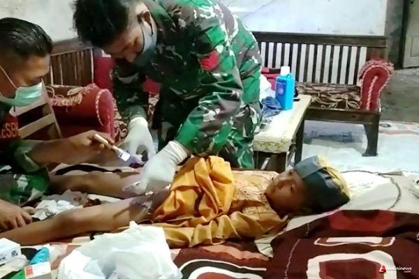 Tampak Kopka Dilyanto, anggota Satgas TMMD Reguler 109 Brebes dari Klinik Pratama Kartika 13 Brebes, Denkesyah 04.04.01 Purwokerto, sedang menjahit kulum si bocah yang telah dipotong, di rumahnya.