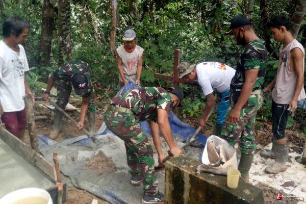Satgas pengamanan Perbatasan RI-Malaysia Yonif 407/Padmakusuma Pos Nanga Bayan melaksanakan kegiatan karya bhakti TNI membantu pembersihan pemakaman umum dan penyemenan makam alm Bapak Julius di tempat pemakaman umum Desa Nanga Bayan Kec. Ketungau Hulu Kab.Sintang, Kalimantan Barat. (07/10/2020)