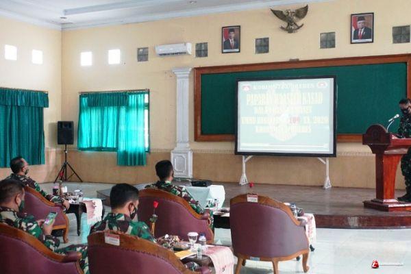 Brebes – Sebelum berkunjung ke Desa Kalinusu, Kecamatan Bumiayu, Kabupaten Brebes, Jawa Tengah, untuk melihat progres pekerjaan fisik/infrastruktur yang dilakukan Satgas TMMD Reguler 109 Kodim 0713 Brebes, Tim Pengawasan dan Evaluasi (Wasev) PJO (Penanggung Jawab Operasi) TMMD Kasad, menerima paparan Dansatgas TMMD Reguler 109 Brebes/Dandim, Letkol Armed Mohamad Haikal Sofyan, di Aula Makodim Brebes, Kamis (8/10/2020).