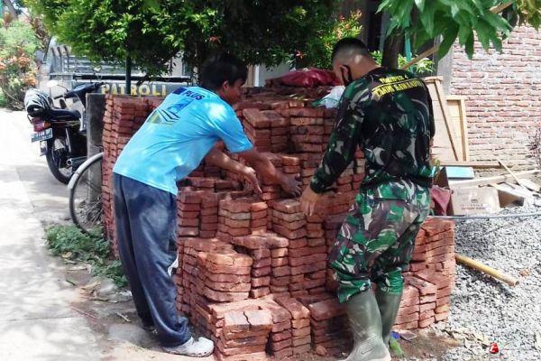Terlihat Serda Rosi Antoko Putro yang di dampingi Busroh (51), yang warga Dusun Kacangan Lor 07/04, Desa Sendangkulon, penerima bantuan tersebut mengecek langsung jenis bata yang datang dan yang akan digunakan pembangunan RTLH.