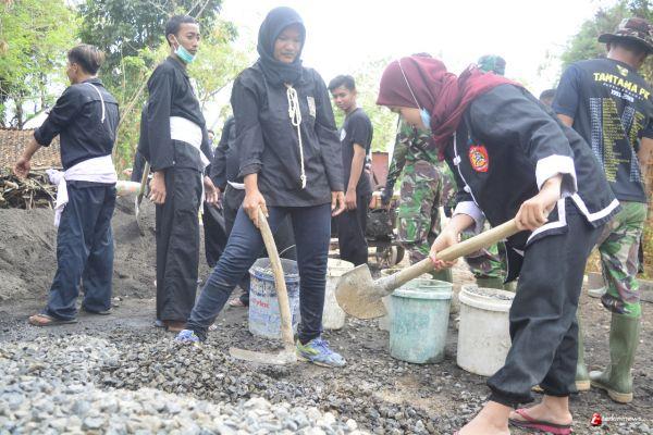 Dua orang sosok Srikandi dari perguruan silat PSHT dan IKSPI terjun langsung bergotong royong bersama Anggota Satgas TMMD di desa Tebluru, Kecamatan Solokuro, Kabupaten Lamongan.