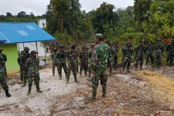 SINTANG – Kapten Inf Wilson Gurning yang menjabat sebagai Perwira Seksi Teritorial (Pasiter) memberi arahan di pagi hari kepada prajurit yang terlibat satgas TMMD 109 / Sintang, Kamis (24/09/2020).