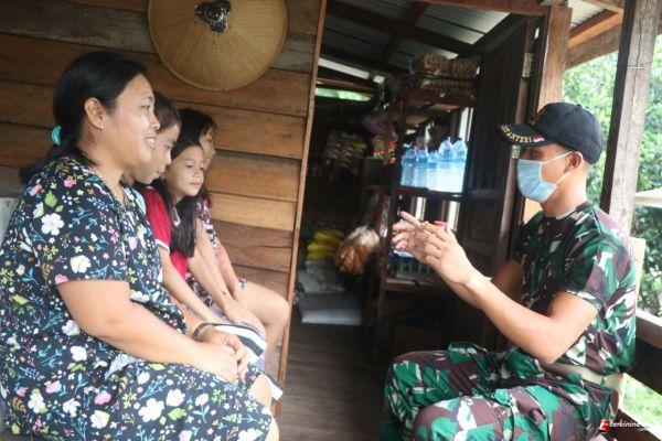 SINTANG - Anggota Satuan Tugas (Satgas) TNI Manunggal Membangun Desa (TMMD) Reguler 109 Kodim 1205 Sintang, Prada Supriyadi terlihat tengah berbicang ria dengan empat wanita remaja di Desa Wira Yuda Kecamatan Ketungau Tengah, Jumat (09/10/2020).