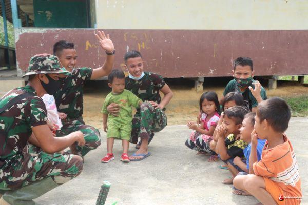 SINTANG - Anggota Satgas TMMD 109 / Sintang salah satunya adalah Prada Ray Jorbi merupakan sahabat Anak-anak. Pagi itu Anggota Satgas TMMD 109 / Sintang bermain bersama anak-anak warga desa Tirta Karya, Kecamatan Ketungau, Kabupaten Sintang, Kalimantan Barat, Sabtu (10/10/2020).