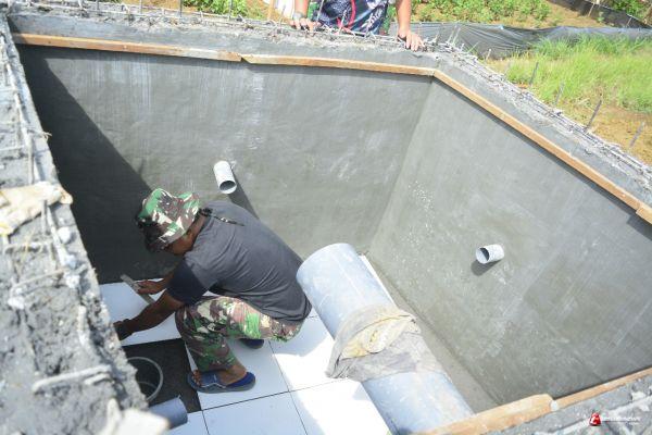 "Saat ini sudah pada tahap pemasangan pipa di samping sampingnya untuk pembagian air. Bangunan bak pembagi air sendiri sudah terlihat kokoh dan dasaranya kita keramik,"jelas Danki Satgas Kapten Chb Suroso.