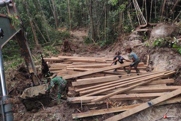 Satgas TMMD 109 Dampingi Penyiapan Kayu untuk Bangun Jembatan
