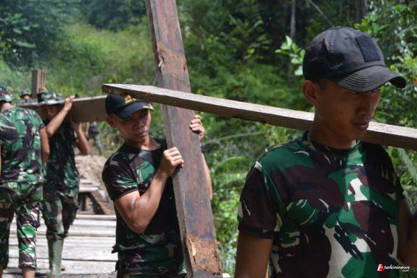 Terlihat Serda Robi bersama rekannya sedang memikul papan untuk pembangunan jembatan untuk sasaran pertama di Desa Tirta Karya.