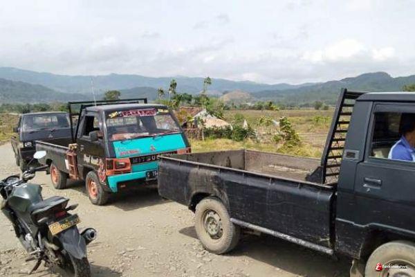 Tampak kesibukan sejumlah pick up pengangkut material pasir dan batu untuk pengerasan jalan tembus dari Dusun Karanganyar ke Kedung Kandri, Desa Kalinusu itu. Senin (11/10/2020).