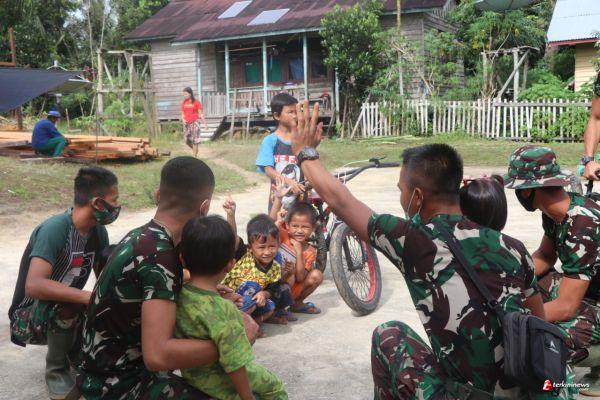 SINTANG - Satgas TMMD 109/ Sintang yang tengah bertugas di Desa Tirta Karya mempunyai berbagai cara untuk bisa dekat dengan anak-anak, sabtu(10/10/2020). Bahkan, respon anak-anak Desa Tirta Karya dan Desa Wira Yuda, kian hari kian tidak ada jarak dengan Sejumlah Anggota Satgas TMMD 109/ Sintang itu.