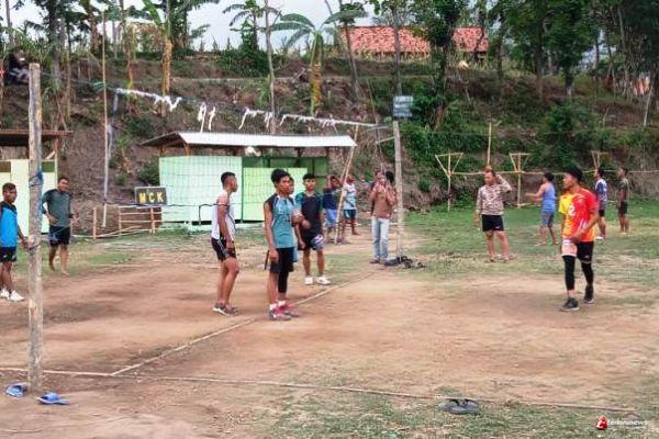 Tampak sejumlah anggota Satgas TMMD bersama pemuda Desa Kalinusu, melakukan pertandingan voli persahabatan untuk mengisi waktu istirahat sore sambil menjaga kebugaran tubuh sekaligus menjalin keakraban, di lapangan voli yang berada di samping Lapangan Sepakbola Kalinusu. Senin (12/10/20202).