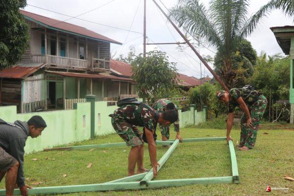 SINTANG - Bakal dikunjungi Tim Pengawasan dan Evaluasi (Wasev) dari Komando Atas, Serka Erwin, salah satu Anggota Satgas TMMD 109/ Sintang memimpin anggotanya mempersiapkan penyambutan Tim Wasev di Posko Merakai Kecamatan Ketungau Tengah, Kabupaten Sintang, Minggu (11/10/2020)
