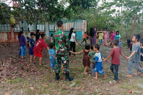 SINTANG - Anggota Satuan Tugas (Satgas) TNI Manunggal Membangun Desa (TMMD) Reguler 109 Kodim 1205 Sintang Prada Yuel membimbing permainan anak-anak di Lokasi TMMD Desa Wira Yuda Kecamatan Ketungau Tengah, Minggu (11/10/2020).