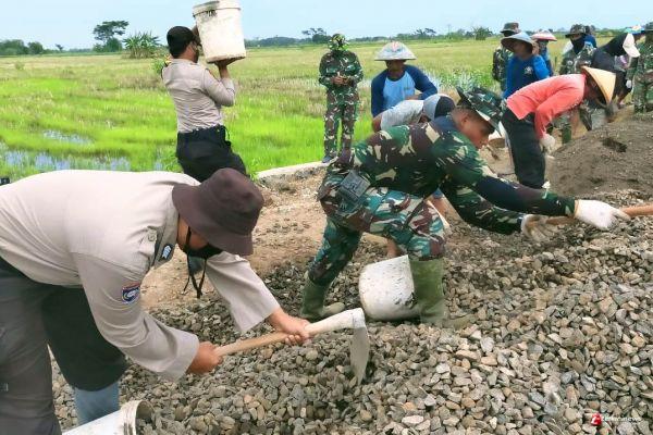 Itu terlihat saat Personil TNI dan Polri serta warga desa yang terus bahu membahu mengerjakan sasaran fisik program TMMD pengecoran jalan di Desa Sendang Kulon.