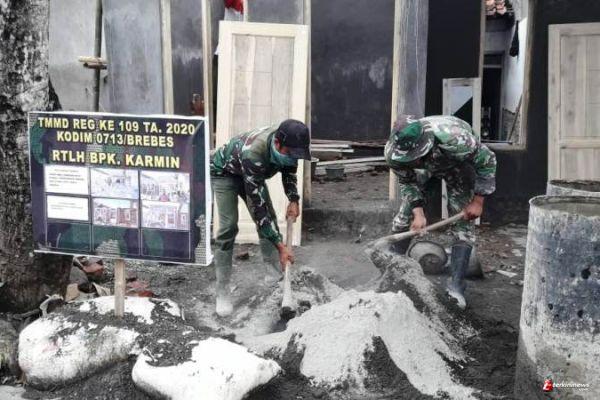 Brebes – Para Teknisi Bangunan Kodim 0713 Brebes, bersama Tim Teknis Satgas TMMD Reguler 109 yang terdiri dari anggota Yonzipur 4 Tanpa Kawandya Kompi A Slawi Kabupaten Tegal, Denzibang IV/I Purwokerto dan juga para tukang bangunan masyarakat setempat, bekerja ekstra untuk merehab rumah tidak layak huni milik Karmin (38), warga Dusun Kutagaluh RT/RW. 02, Desa Kalinusu, Kecamatan Bumiayu, Kabupaten Brebes, Jawa Tengah.