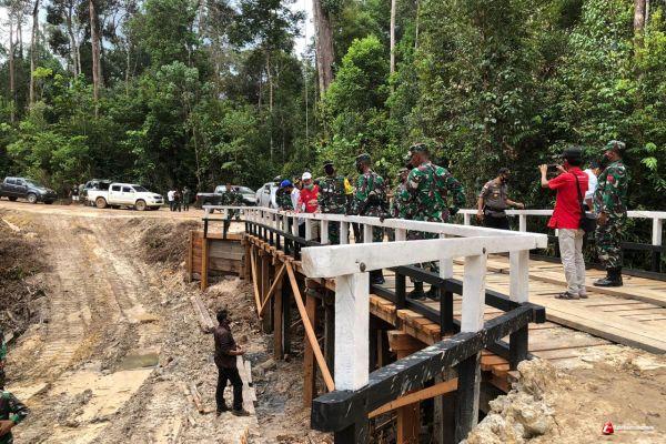 SINTANG - Komandan Satuan Tugas (Dansatgas) TMMD 109/Sintang Letkol Inf Eko Bintara Saktiawan dampingi Tim Wasev dari Korem 121 saat meninjau progres pembangunan sasaran program TMMD di Desa Tirta Karya Kecamatan Ketungau Tengah, Kabupaten Sintang, Rabu (14/10/2020).