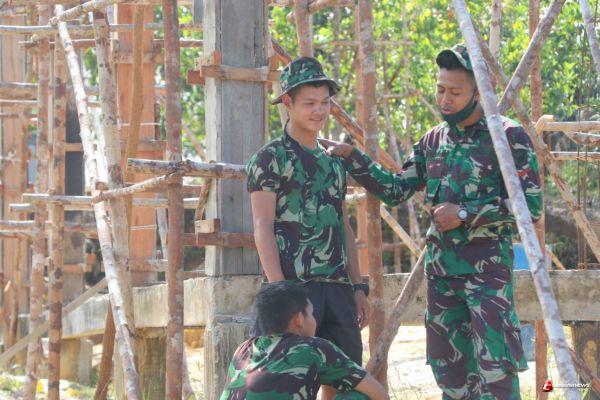 SINTANG - Meski hasil pembangunan fisik TMMD 109/ Sintang di Desa Tirta Karya, Kecamatan Ketungau Tengah, Kabupaten Sintang sudah hampir mencapai sempurna, kopda Riyan salah satu anggota Satgas terus memberi motivasi dan semangat kepada anggota tukang yang akan mengerjakan sasaran pembangunan gereja, Selasa (13/10/2020).