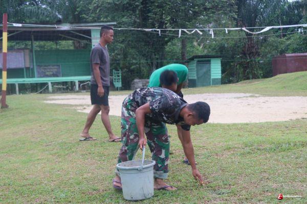 SINTANG - Anggota satgas TMMD 109 Kodim 1205/Sintang terlihat sedang melaksanakan korve disekitaran pangkalan, Jumat (16/10/2020).