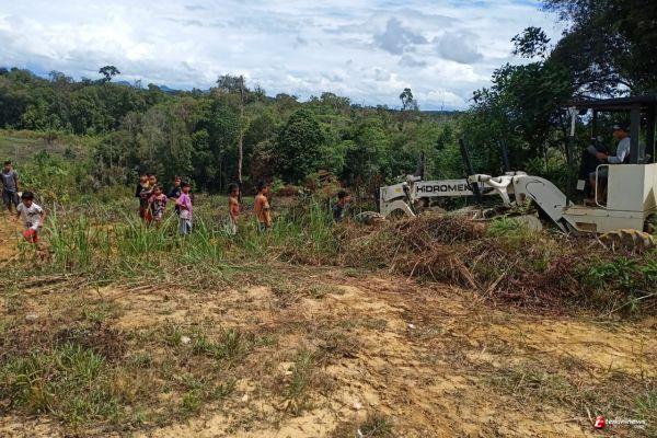 SINTANG - Keceriaan Anak-anak Desa Tirta Karya melihat alat berat yang sedang bekerja menyelesaikan pembangunan jalan, jum'at(16/10/2020).