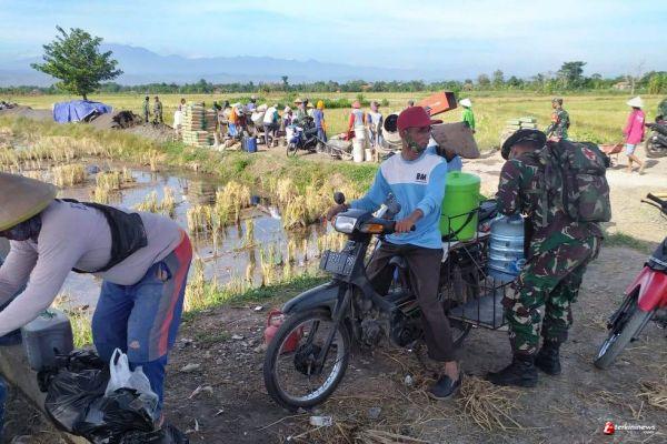 Tampak Serda Rosi, Babinsa Desa Sendang kulon, Kecamatan Kangkung, Kendal ikut menurunkan galon dan makanan ringan dari sepeda motornya yang tiap hari untuk mengangkut logistik ke sasaran TMMD Sendang Kulon.