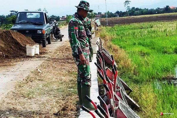 Pratu Okta salah satu anggota satgas TMMD - Reg -109 sedang menyusun serta menata angkong di pinggir tepian sawah dan disandarkan pada bahu jalan.